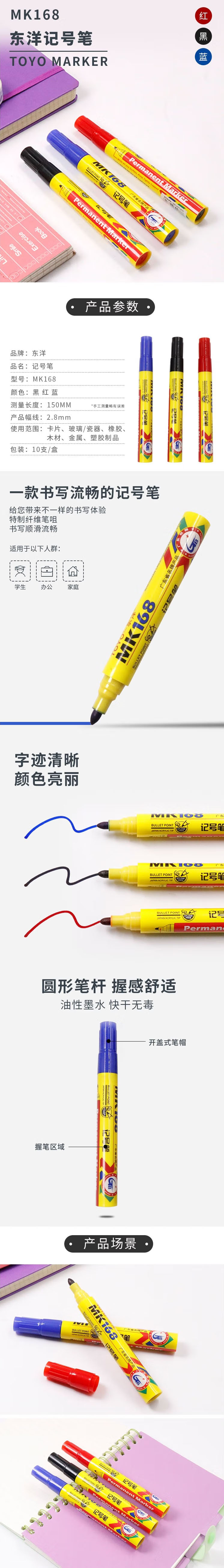 东洋(TOYO)MK-168 记号笔 油性记号笔 大头笔 2.8mm黑色永久性墨水,速干、防水、不褪色,几乎能书写于任何物体表面。 苏州辉达娱乐是一家一站式采购配送的服务型企业.我们有着十几年的采购经验,实力服务团队,一对一客服,自建送货团队,常备库存,让您省事省力省心的解决采购的问题.